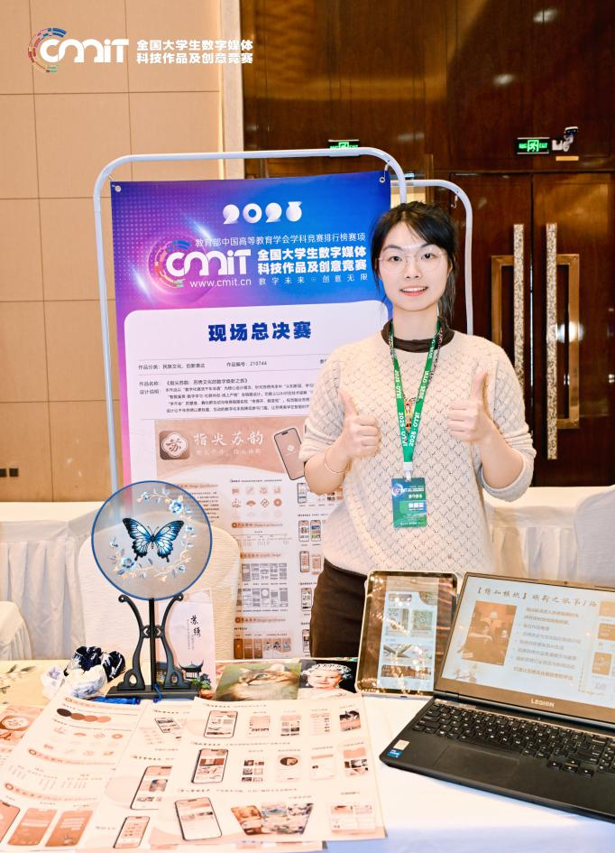 刘跃然同学的作品《指尖苏韵:苏绣文化的数字焕新之旅》以数字化手段展现苏绣艺术魅力,推动传统非遗文化的创新表达,助力传统刺绣工艺的当代转化,荣获全国二等奖!