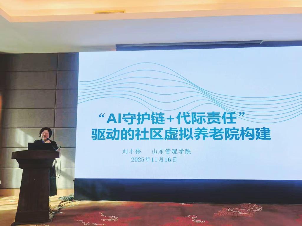 刘丰伟发言的主题是《“AI守护链+代际责任”驱动的社区虚拟养老院构建》,针对传统养老服务供给主体单一、人员参与不足、资源调配割裂等现实痛点,基于福利多元主义等理论支撑,提出构建“AI守护链+代际责任”驱动的社区虚拟养老院生态体系,通过积分机制有效联动“社区、高校、商家”三大圈层,形成“技术赋能、多元参与、激励相容”的可持续运行体系,为中国式社会化养老体系建设提供新的理论视角与实践路径。