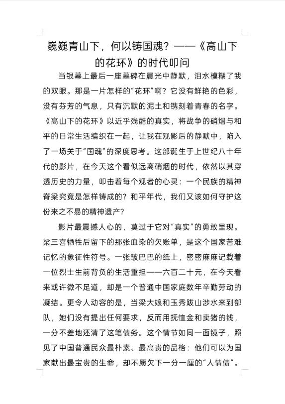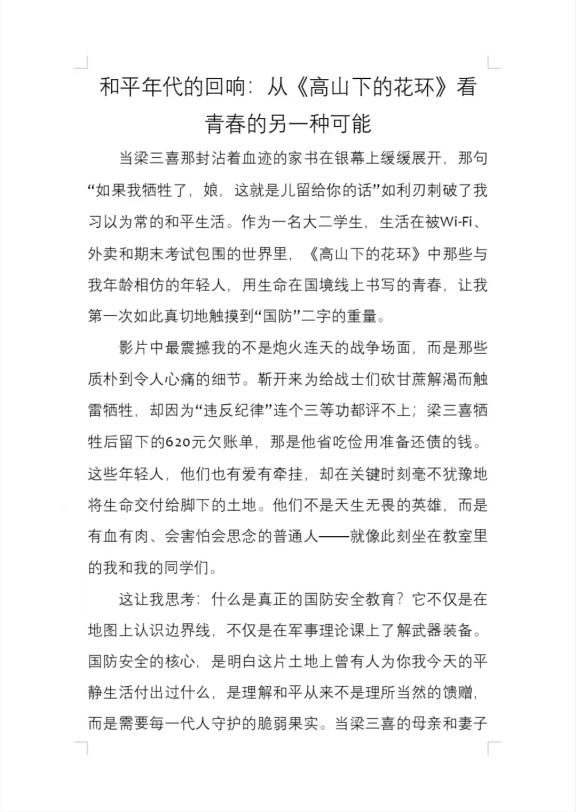 电影结束,思考才刚刚开始。当00后的笔触与80年代的烽火相遇,我们写下的是传承,是承诺:无论前路多难,都要做那个“有灯必追光”的人。作为人文学院的青年,更应懂得“以文化人,以文育人”的使命——要将电影里展现的精神内化为情怀,外化为行动。如今躬逢盛世而前方路遥,我们当接过历史的接力棒,涵养人文,记录英雄的温度,传承信仰的重量。不仅要铭记花环背后的牺牲,更要书写属于这一代人的担当,将观影时的热泪转化为立言立德的实践,为实现中华民族伟大复兴贡献人文力量。
