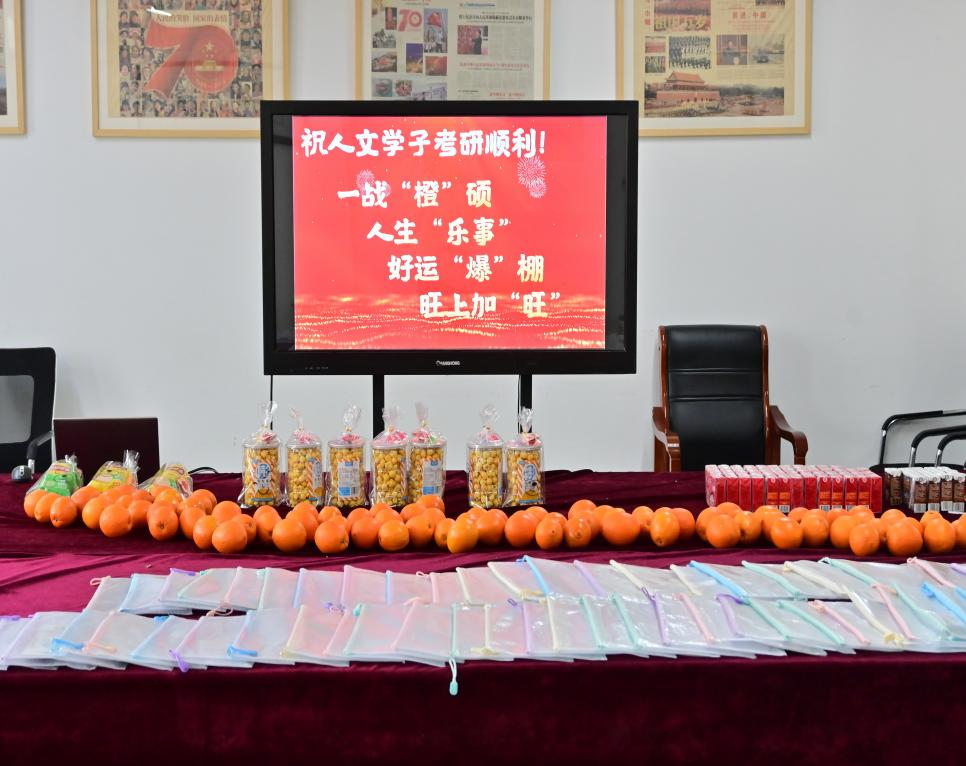 风正帆满,踏浪启程。2025年研究生招生考试将于本周末拉开帷幕,为助力考研学子逐梦远航,人文学院于12月18日开展“一战‘橙’硕”考研送温暖活动。人文学院领导班子成员与毕业班辅导员共同为备考学生送上“考研助力大礼包”,全体在校备考学生参加活动。
