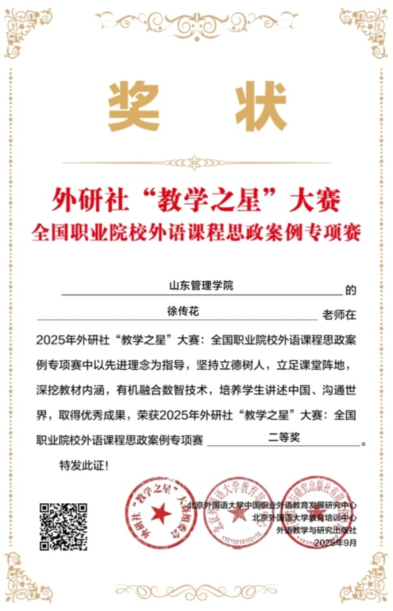 2025年外研社“教学之星”大赛:全国职业院校外语课程思政案例专项赛获奖名单公布,我院大学外语教研室教师徐传花凭借出色的课程思政教学案例荣获全国二等奖。