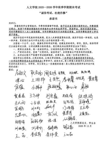 此次诚信考试主题班会通过政策解读、案例警示、承诺践行的多元形式,实现了考纪教育与诚信引导的有机结合,有效提升了学生的规则意识与道德素养,为营造风清气正的期末考试氛围、深化学院学风建设奠定了坚实基础。下一步,人文学院将持续推进学风建设与道德教育深度融合,把诚信教育贯穿人才培养全过程,通过常态化教育引导、规范化管理监督,推动诚信意识内化于心、外化于行,助力学生成长为品德高尚、学识扎实、勇于担当的新时代青年。