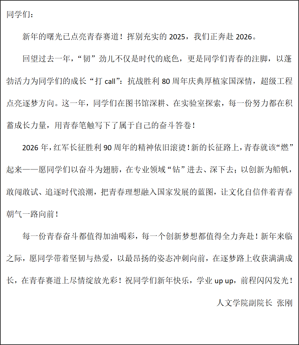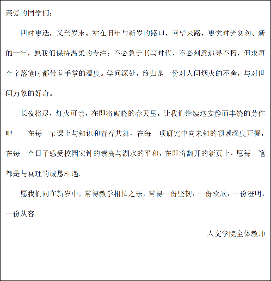 青衿逐梦,岁序更新。当2026年的第一缕晨光穿透冬日的薄雾,人文学院的师者们,也想在这新旧交汇的时刻,将心中的祝愿与嘱托,轻轻送到每一位同学的身边。这是一封来自学院的书信,承载着对过往时光的珍视,也饱含着对未来的诚挚期盼——愿你在人文的土壤里,扎根生长,向光而行。