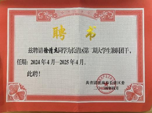 个人简介:徐清杰,男,汉族,中共预备党员,人文学院2022级网络与新媒体专业学生。曾任第二十六届山东管理学院学生会主席团成员,第十三届人文学院团总支学生会执行主席,第一届山东管理学院青年团建中心办公室主任、第四届中国青年网校园通讯社山东管理学院通讯站视摄部部长。
