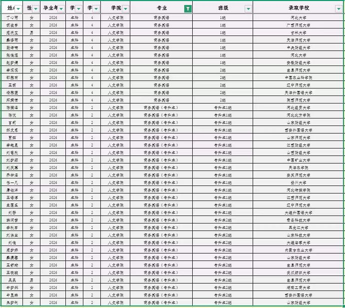 时光不负耕耘,奋斗终有回响。在2026年全国硕士研究生招生录取中,我院商务英语专业39名学子成功上岸,录取规模创历史新高。其中,2024级商务英语专升本班93名同学中27人圆梦研究生,录取率达29.03%;2022级商务英语本科班12名同学被吉林大学、中央财经大学、陕西师范大学等“双一流”及知名高校录取,踏上更高学术平台,续写人文学子风采,亦为我院商务英语专业人才培养再添亮眼成绩。